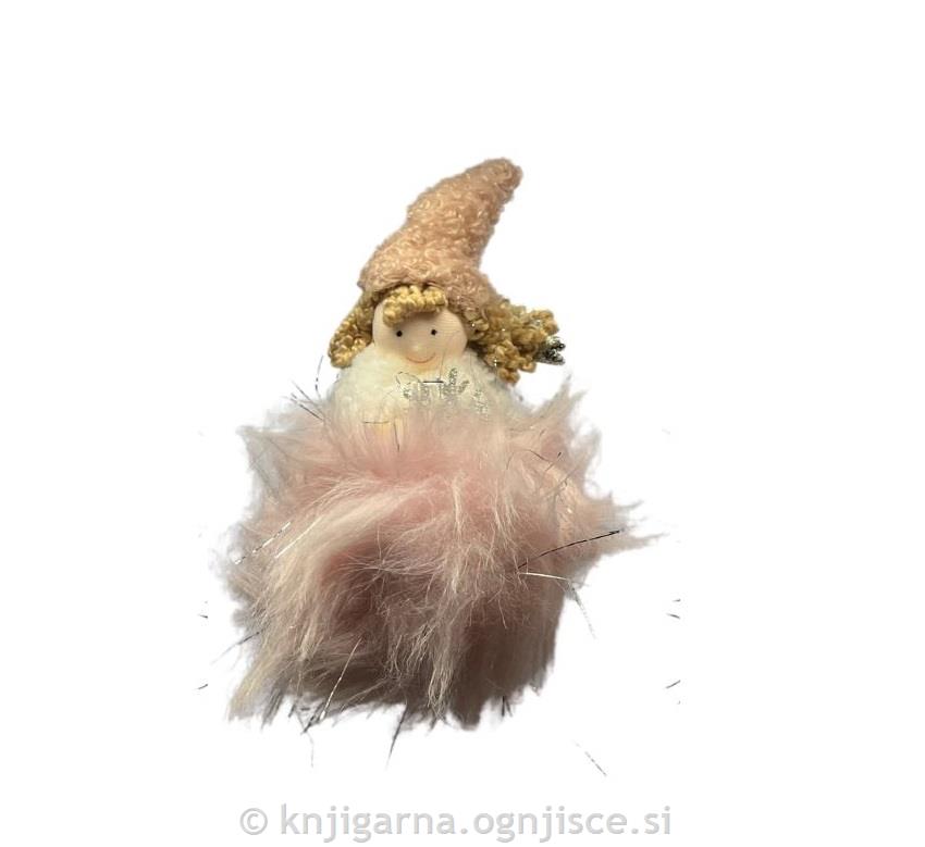 Angel dekorativni iz blaga v roza barvi s srebrnimi dodatki s snežinko, viseči, višina 14cm