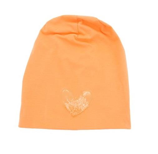 Prehodne kape za deklice, narejene iz bombaža, z dekorativnim plastičnim srčkom na sprednji strani, polnjenim z bleščicami. Kape so elastične, da se lepo oprimejo in prilegajo.