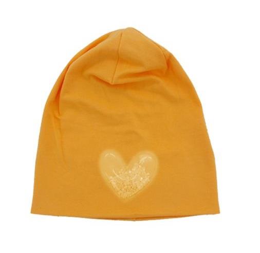 Prehodne kape za deklice, narejene iz bombaža, z dekorativnim plastičnim srčkom na sprednji strani, polnjenim z bleščicami. Kape so elastične, da se lepo oprimejo in prilegajo.