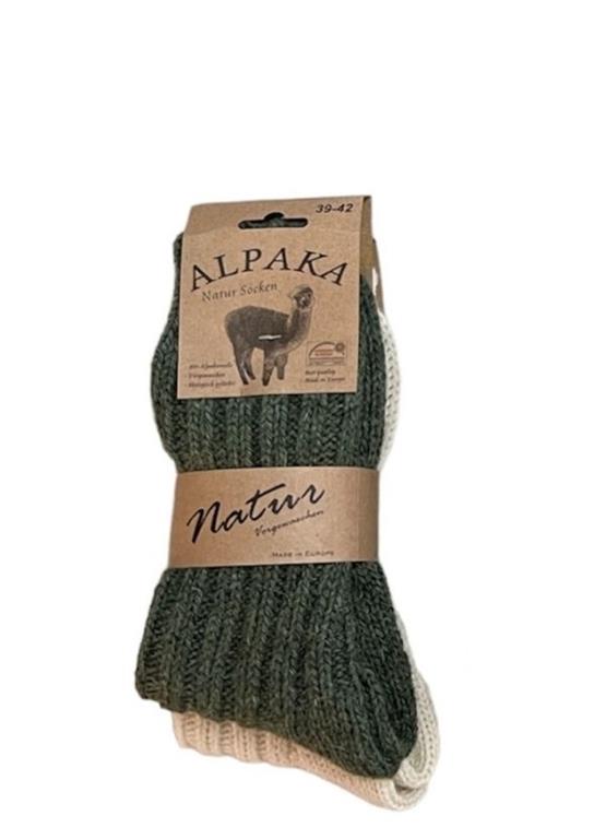 Volnene nogavice za odrasle številka 39-42, vsebuje alpakino volno, 2 para v zavitku v zeleni in beli barvi.