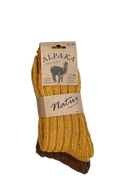 Volnene nogavice za odrasle številka 35-38, vsebuje alpakino volno, 2 para v zavitku v rjavi in rumeni barvi.