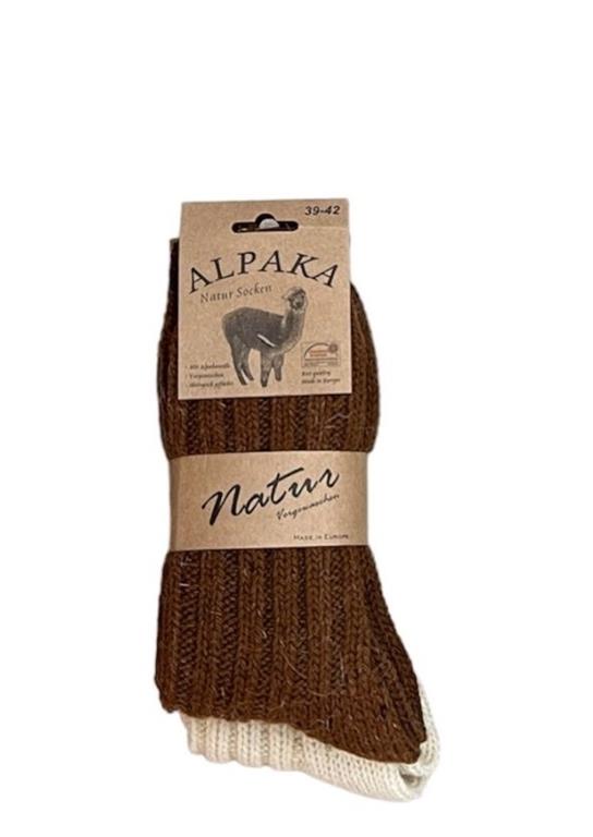 Volnene nogavice za odrasle številka 35-38, vsebuje alpakino volno, 2 para v zavitku v rjavi in beli barvi.