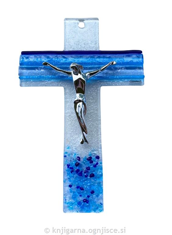 Steklen stenski križ v modrih odtenkih s korpusom v srebrni barvi