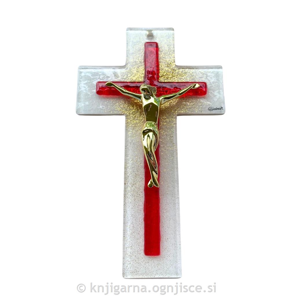 Steklen stenski križ v beli barvi, poudarjen rdeč križ v sredini; z zlatimi lističi in korpusom v zlati barvi