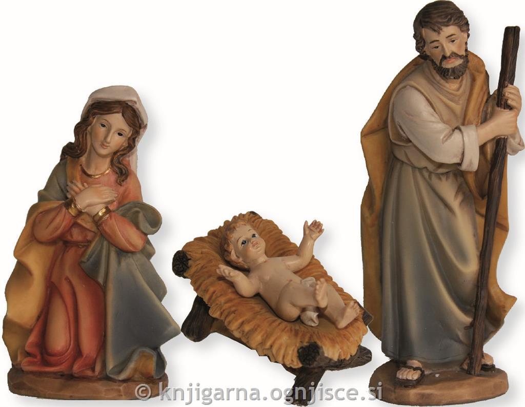 Komplet vsebuje 11 figur: sveto družino, oslička, kravico, pastirja z ovčko, angela, ovčko in svete tri kralje.
