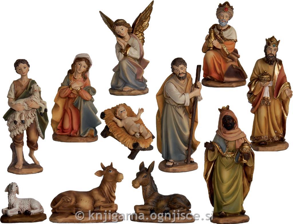 Komplet vsebuje 11 figur: sveto družino, oslička, kravico, pastirja, ovčko, angela in svete tri kralje.