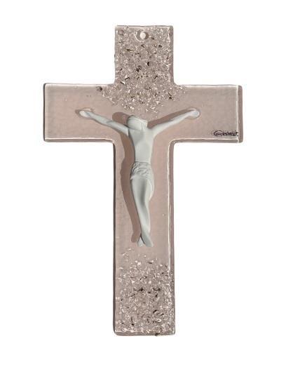 Stenski križ v rožnati barvi z dodani srebrnimi detajli ob robovih. Dodan korpus v beli barvi, stiliran.