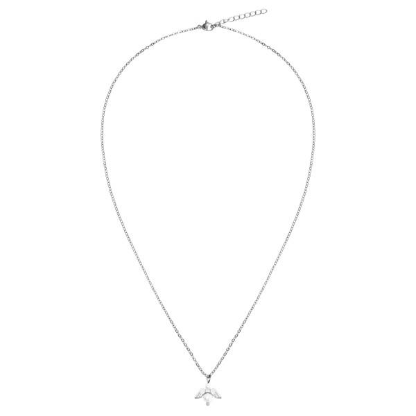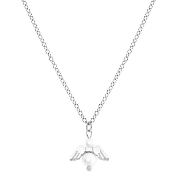 Eleganten, nežen obesek z verižico, ki prikazuje motiv angela varuha, okrašen z dvema bisernima perlama iz biserne matice.