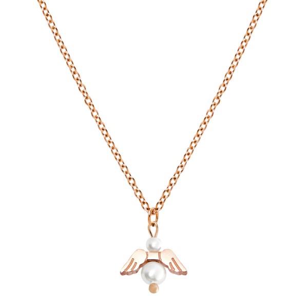 Eleganten, nežen obesek z verižico, z motivom angela varuha, okrašen z dvema bisernima perlama iz biserne matice.