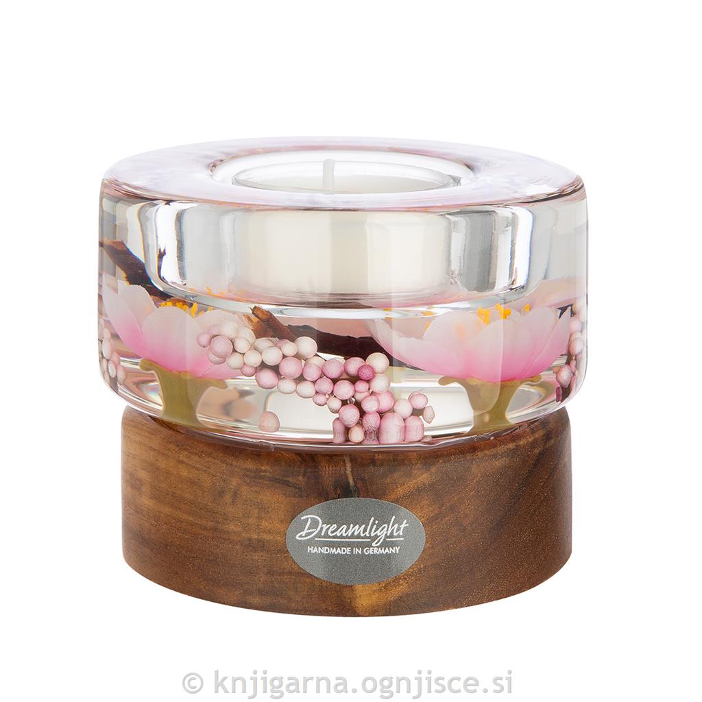 Steklen svečnik za čajno svečko, dodan lesen podstavek.