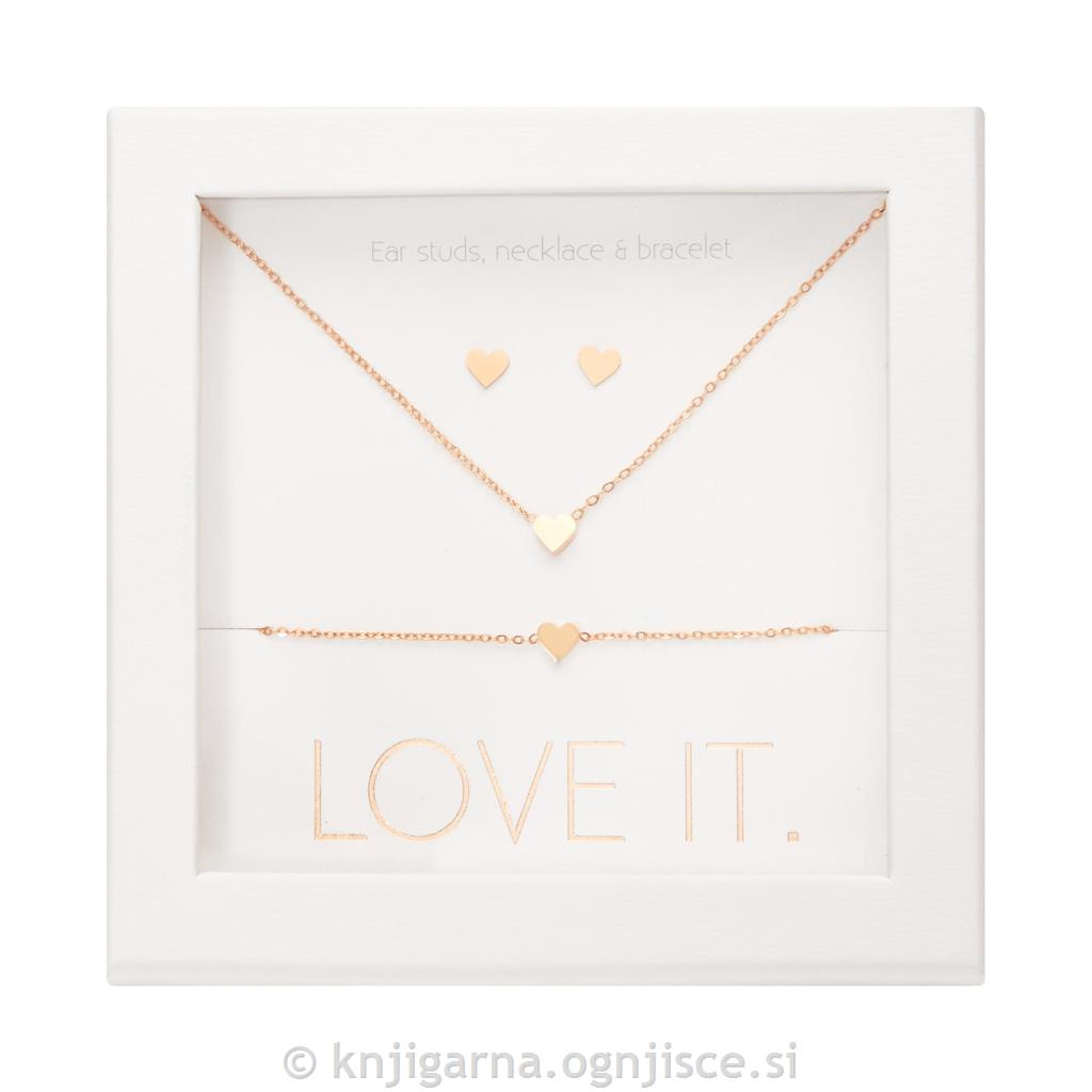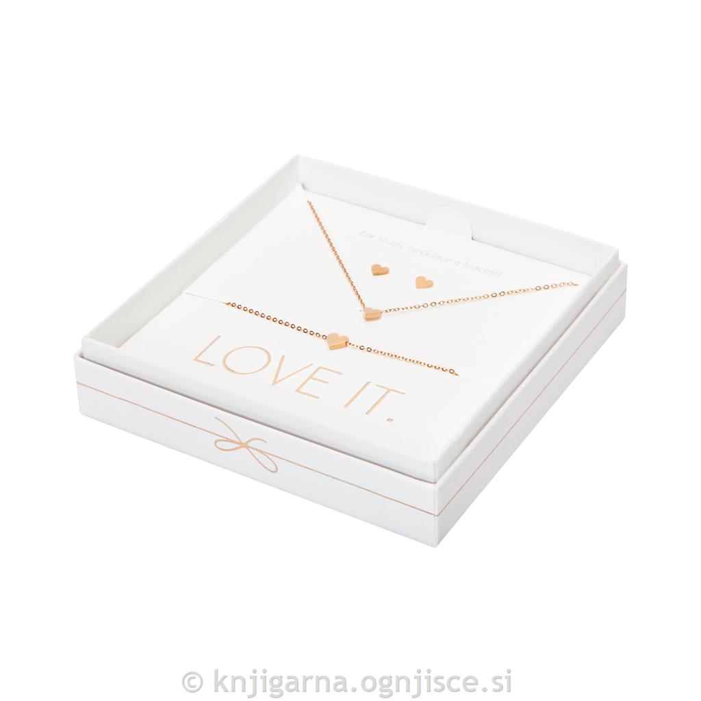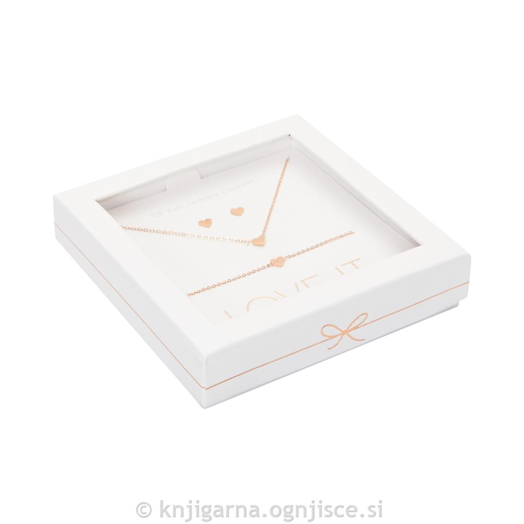 Darilni komplet, ki vključuje zapestnico, ogrlico in uhane s simbolom srca. Pakirano v elegantni darilni embalaži.