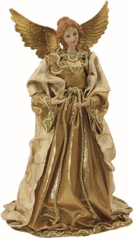 Elegantni zlati angel – oblečen v razkošno zlato obleko s čipkastimi detajli in sijočimi krili, prinaša pridih topline in simboliko božičnega duha v vsak prostor.